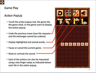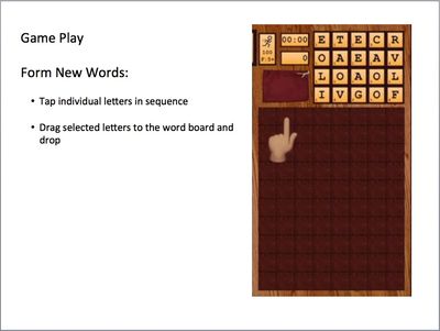 Two types of game play are available: time-limited games and score-target games. In a time-limited game, the goal is to get the highest score in the allotted time. Timed games are 2, 4, or 6 minutes long. In a score-target game, the goal is to reach the target score in the shortest amount of time. Three score targets are available: 100, 150, and 200 points for iPads; 75, 100, or 125 points for large iPhones; and 50, 75, and 100 points for small iPhones.