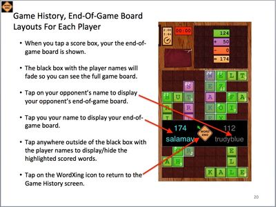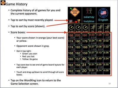 WordXing maintains a history of your recent and best games. Game histories include the final game board layout and score for each player. WordXing also tracks and displays the highest scores obtained by game type, opponent, and language.