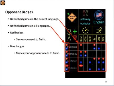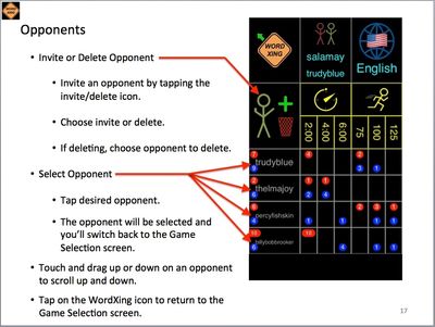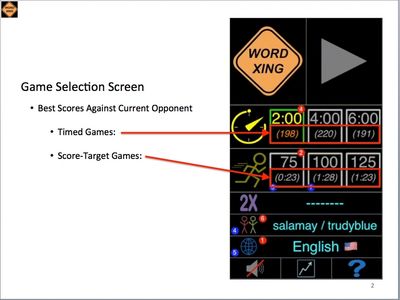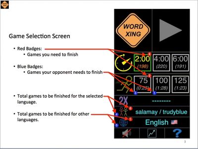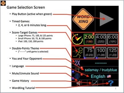 WordXing can be played individually or against another player (the multiplayer features are only supported on devices with iOS version 10 or later). WordXing uses Apple's Game Center for multiplayer games to enable players to initiate games with friends or random players. For multiplayer games, the player with the highest score in a time-limited game wins and the player with the shortest game time in a score-target game wins. For multiplayer games, WordXing maintains a list of active opponents and the number of games posted to and pending from each opponent.