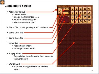 The score value for a word is the sum of the point values associated with each of its letters. To make each game a little different, a random theme is chosen when the game starts. The theme is composed of a special, "2X" letter and word length (e.g., "F:5+", where "F" is the special letter and "5+" means 5 or more letters). Correctly spelled words that contain the special letter and are at least as long as the special word length are scored as double their normal point value. Long words ("7+") are always scored at double their normal value.